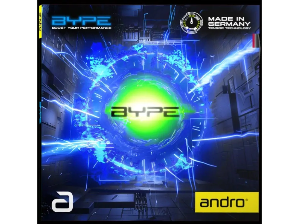 Andro Bype - dynamičtější a o trošku tvrdší (45 st.) verze potahu Andro Bype SFX, ideální pro variabilní topspinovou hru. Záruka okamžité přesné zpětné vazby. Spinový topsheet umožňuje veškeré varianty topspinové hry, kvalitní technologie TENSOR v houbě ( mezi molekuly kaučuku je zabudována organická látka srovnatelná s pružinou) - výsledkem je vysoká zásoba energie schopná se uvolnit při zásahu míčku pálkou - tzn. vyšší rychlost, lepší spin, více citu pro míček.